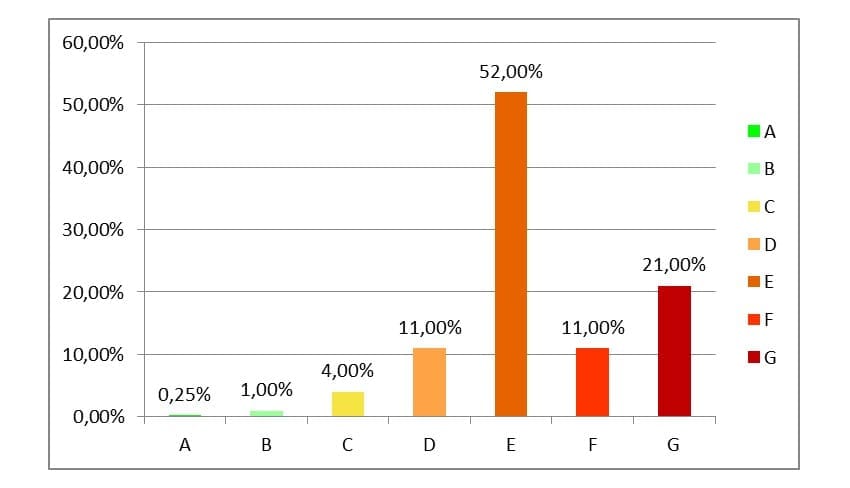 Según el informe de Certificación Energética de Edificios de diciembre de 2021 estos son los porcentajes medios de los edificios en España según su calificación energética: